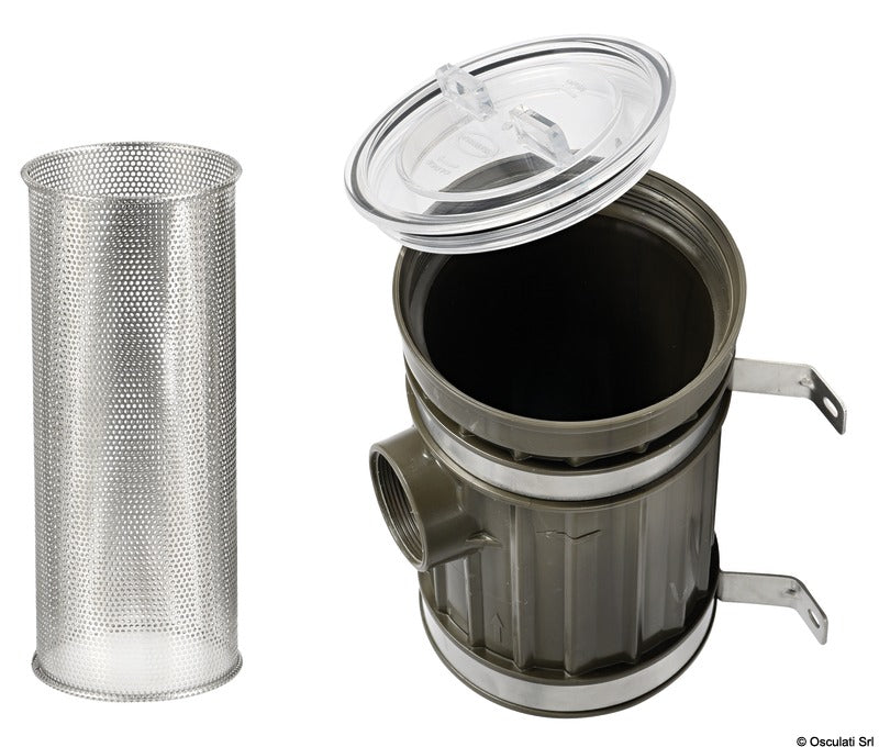 Carcassa in tecnopolimero con coperchio a vite in policarbonato trasparente. Elemento filtrante estraibile in acciaio inox. Bracci di fissaggio a parete girevoli in acciaio inox.